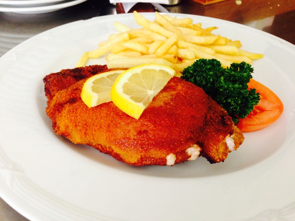 Bistecca maiale Cordon bleu, patate fritte, insalata